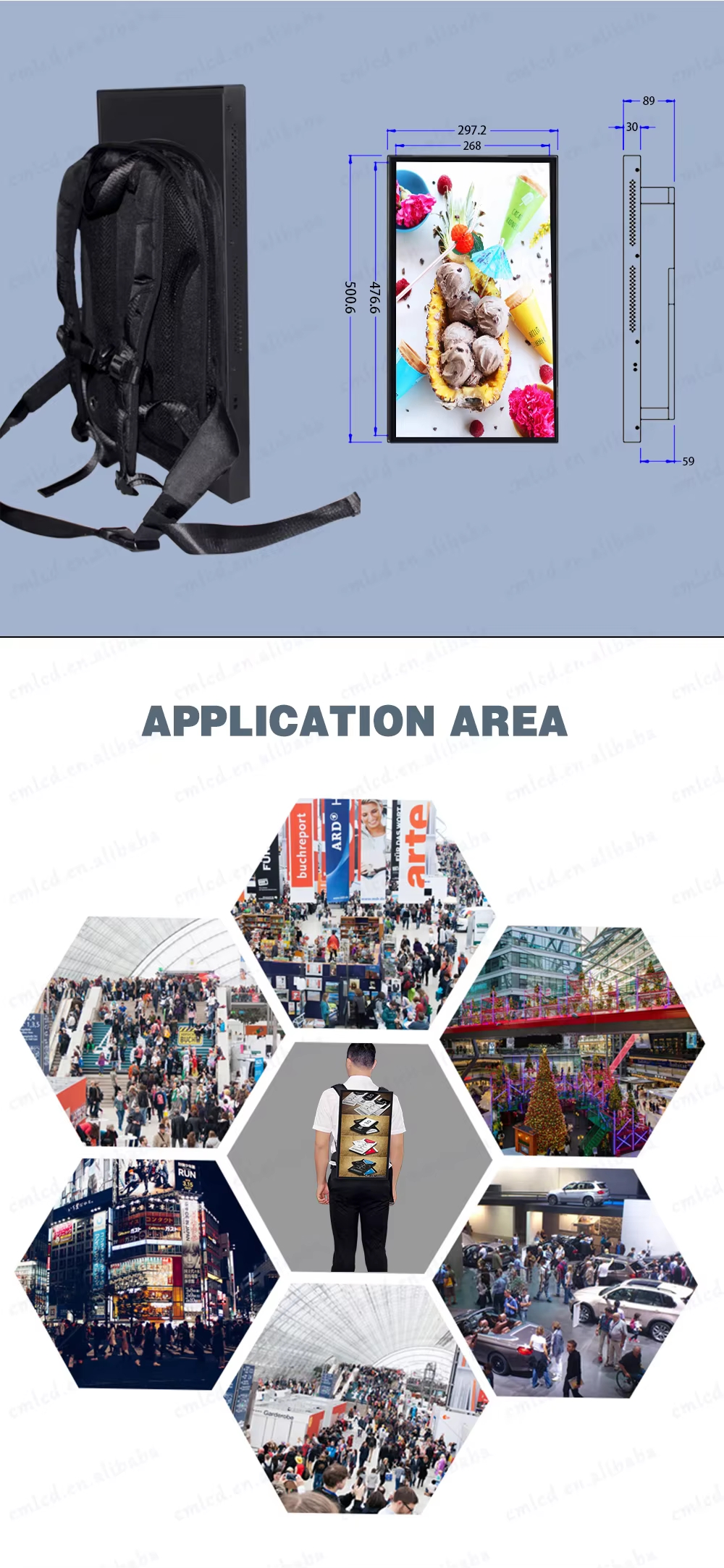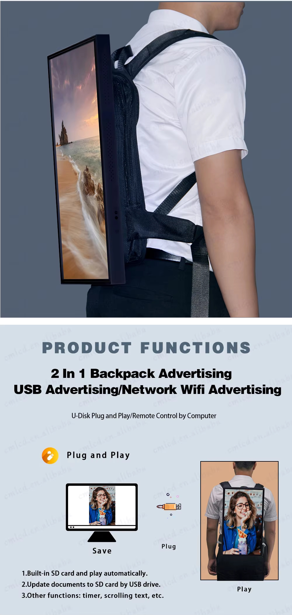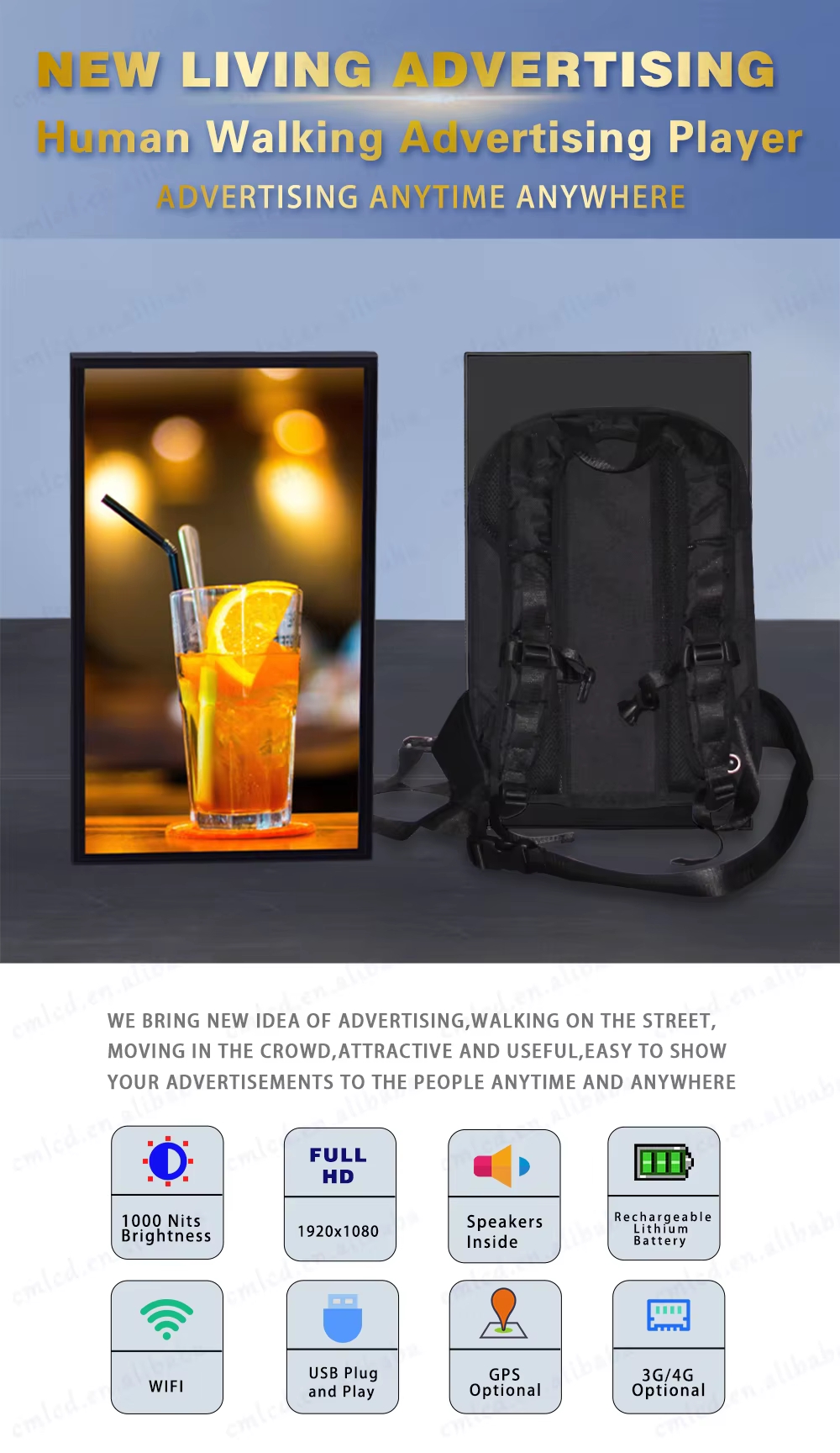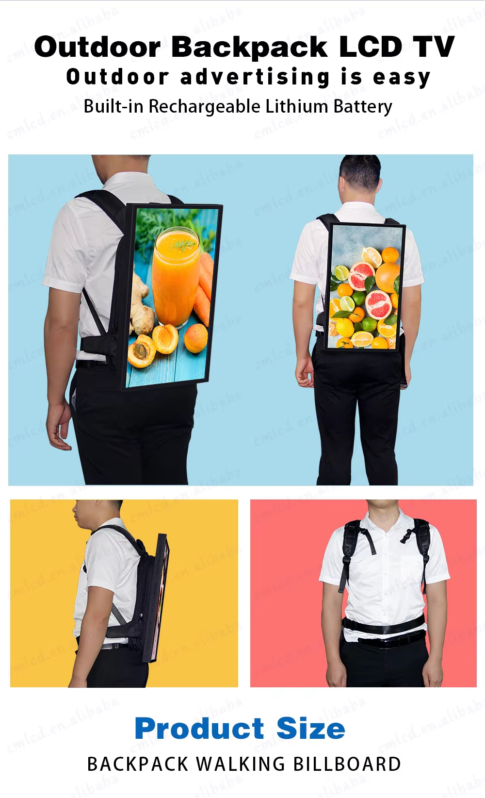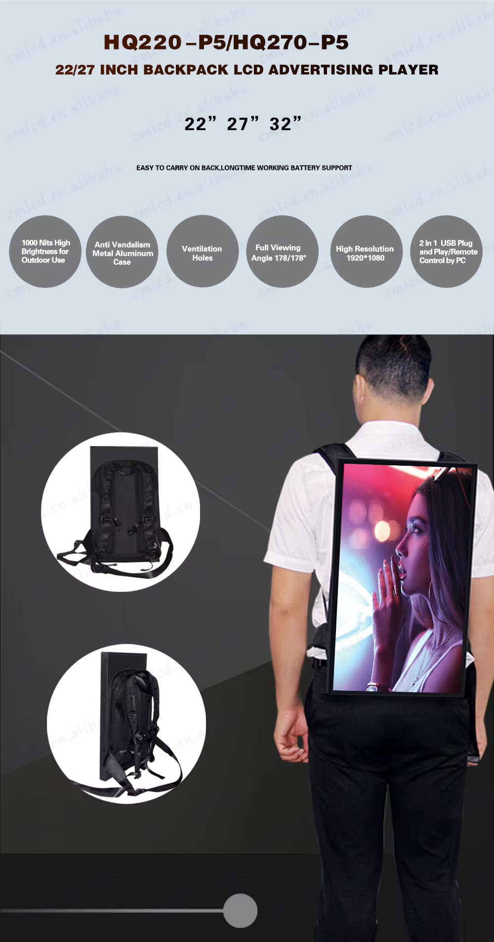 13.3-21.5-32inch Backpack LCD Paparan dengan Power Bank, LED Backpack Walker Billboard Walking Display LCD Mobile Iklan Digital Bag Advertising Machine Signage Bateri Portable, terutamanya digunakan dalam Pengiklanan Terbitan.