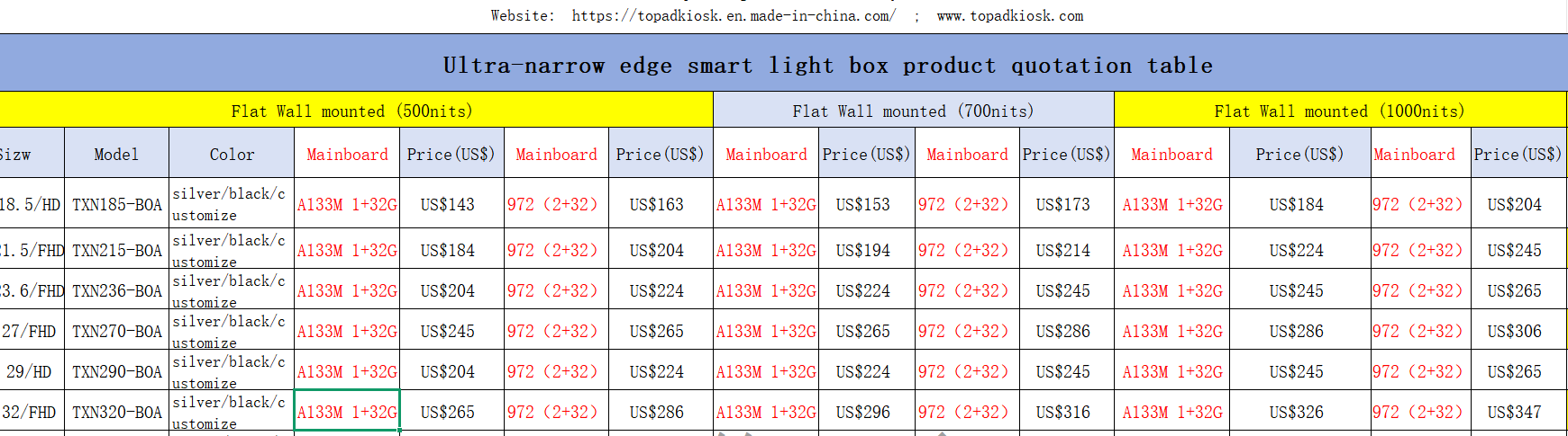 Mencari bezel 4K sempit yang boleh dipercayai Dinding dalaman Digital Mount Digital Signage 1000Nits untuk memenuhi keperluan perniagaan anda? Lihatlah lebih jauh daripada Shenzhen Topadkiosk Display Technology Co., Ltd. sebagai pengeluar dan pembekal terkemuka yang berpusat di China, kami mengkhususkan diri dalam menyediakan produk papan tanda digital yang berkualiti tinggi dan penyelesaian yang disesuaikan dengan pelbagai aplikasi.