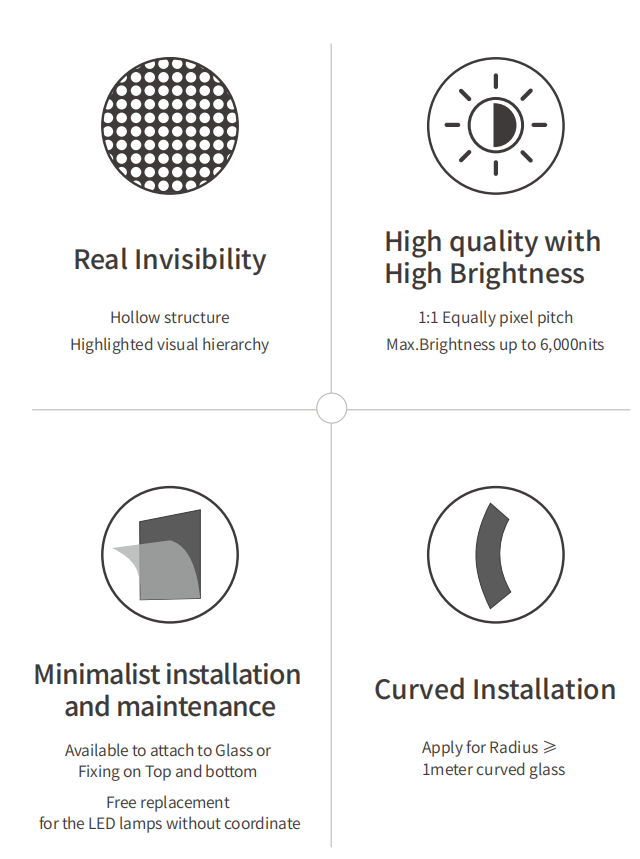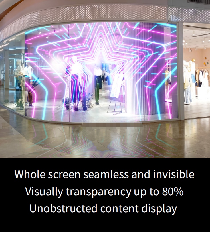 Sebagai reka bentuk aluminium die-cast yang disesuaikan, skrin paparan LED telus adalah ringan, nipis dan cepat dipasang sebagai ciri yang paling penting, sesuai untuk aplikasi pemasangan kaca pusat membeli-belah. Skrin paparan LED telus diproses oleh sistem kawalan segerak, dan boleh menerima pelbagai isyarat input video seperti DVI, VGA, HDMI, S-Video, Komposit, YUV, dan lain-lain. Warna realistik dan kebolehsuaian yang kuat. Skrin paparan LED telus kami mempunyai kelebihan berikut: